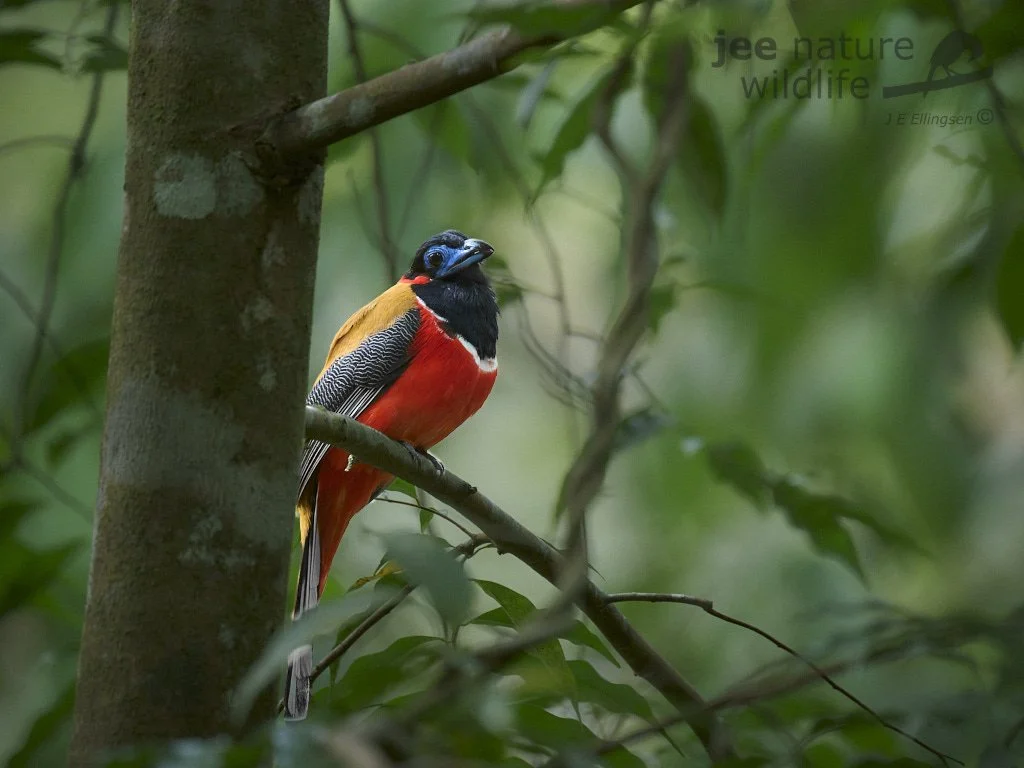The squeaks were the first indication if its presence, but spotting this male Red-naped Trogon deep in the rainforest in Borneo was tricky. Patience was required to find an acceptable angle for a clear shot through dense foliage. Precious little light to play with even in the middle of the day. Shot at 800mm @ f/6.3, 1/250s, ISO 3200.